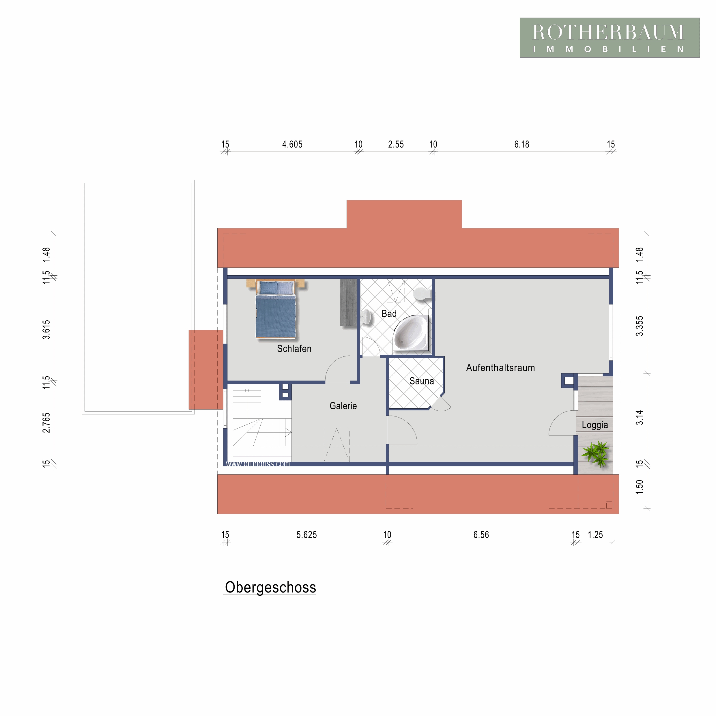 Im Obergeschoß befindet sich das Hauptschlafzimmer mit angrenzendem Vollbad und ein riesiger, etwa 50 qm großer Wohn-/Schlafraum mit vielen Einbauten und Zugang zu einer kleinen, geschützten Terrasse. Hier ließe sich ein wahres Kinderparadies einrichten, aber auch ein Wellness-/Fitnessbereich bietet sich an: eine neuwertige Sauna ist schon vorhanden!
